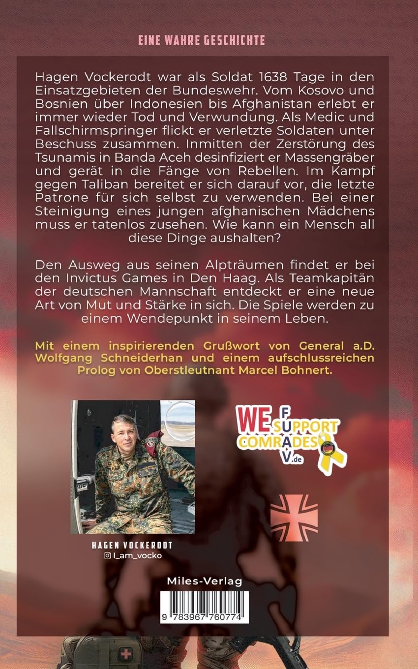 Hagen Vockerodt war als Soldat 1638 Tage in den Einsatzgebieten der Bundeswehr. Vom Kosovo und Bosnien über Thailand bis Afghanistan erlebt er immer wieder Tod und Verwundung. Als Medic und Fallschirmspringer flickt er verletzte Soldaten unter Beschuss zusammen. Inmitten der Zerstörung des Tsunamis in Banda Aceh desinfiziert er Massengräber und gerät in die Fänge von Rebellen. Im Kampf gegen Taliban bereitet er sich darauf vor, die letzte Patrone für sich selbst zu verwenden. Bei einer Steinigung eines jungen afghanischen Mädchens muss er tatenlos zusehen. Wie kann ein Mensch all diese Dinge aushalten? Den Ausweg aus seinen Alpträumen findet er bei den Invictus Games in Den Haag. Als Teamkapitän der deutschen Mannschaft entdeckt er eine neue Art von Mut und Stärke in sich. Die Spiele werden zu einem Wendepunkt in seinem Leben. Mit einem Vorwort von General a.D. Wolfgang Schneiderhan, einem Geleitwort von Brigadegeneral a.D. Michael Bartscher und einem Prolog von Marcel Bohnert.