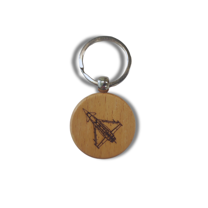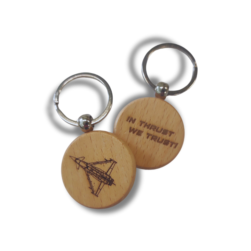 Dieser hochwertige Schlüsselanhänger aus Holz vereint Präzision und Stärke. Die Vorderseite ziert eine detailgetreue Lasergravur des Eurofighters, während der ikonische Slogan „In Thrust We Trust“ auf der Rückseite ein starkes Statement setzt. Perfekt für echte Fans des Eurofighters – ein kraftvolles Accessoire für jeden Tag!